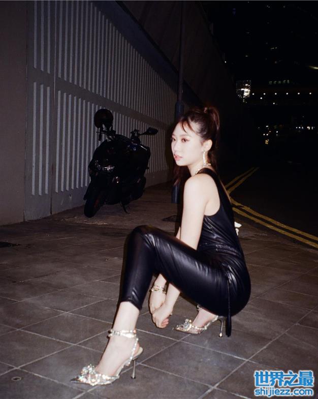 只见甄济如身穿一件单价黑色小背心,下身搭配一条黑色紧身皮裤,脚踩一双银色水晶高跟鞋,手上和脖子上都带着银色配饰,耳朵上的大耳坠更是十分抢眼,扎着高马尾十分有炫酷女孩的感觉。