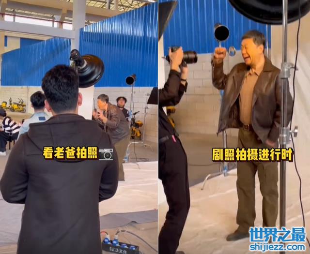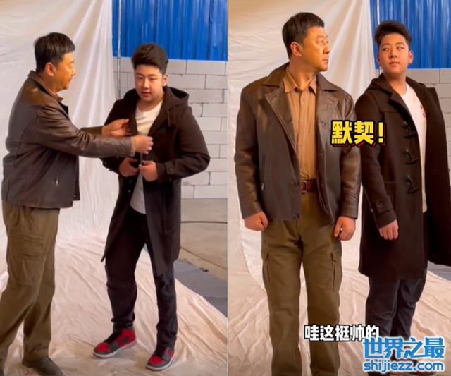 郭涛拍完后就对着石头招手叫过来,石头开心地往郭涛跑来,十分可爱,郭涛见儿子的衣服有些乱,耐心地给他整理,当摄影师开始拍摄时,父子俩人很迅速地摆好动作后,还相视一笑超有默契,周围的工作人员还止不住地夸赞道:“哇这挺帅的”。