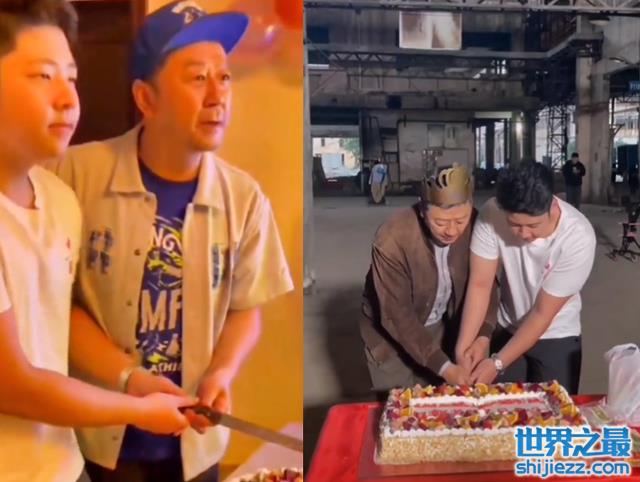 其实,这一次石头来到郭涛的片场是为了给爸爸庆祝生日。他带来了一个方形的大蛋糕,他在片场给和爸爸一起将这个蛋糕切好。而郭涛的头上戴着一个纸质生日“皇冠”。父子俩这一幕非常温馨。