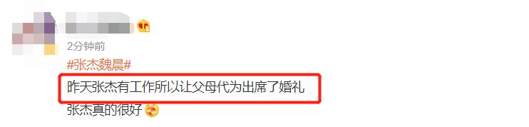 还有魏晨的好兄弟张杰,因为张杰的工作太忙,实在没时间来婚礼的现场,但是张杰叫父母代表自己来现场出席婚礼,铁一般的兄弟感情令人羡慕。