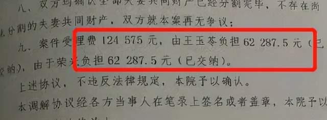 值得注意的是离婚协议中的金钱数字,协议中的第九条写着本案的受理费为124575元,于荣光和王玉苓各自承担一半,双方都已经交纳了这笔钱,据推测夫妻俩分割的财产金额应该在2500万左右。