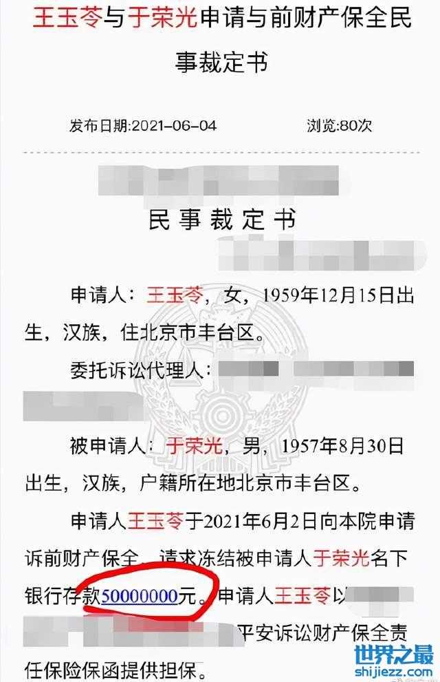 有媒体在网上查询后发现早在2021年6月,王玉苓就向法院申请诉前财产保全,请求冻结申请人于荣光名下银行存款5000万,由此看来当时夫妻双方在财产分割这一块有些争议。
