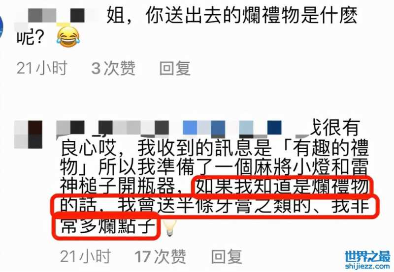 在陈乔恩分享的动态下,有不少网友好奇地问道她的礼物是什么,陈乔恩认真的回答道自己的礼物是朋友家不要的东西用大品牌袋子包装给她的,还细数了里面“黄金马桶烟灰缸”“逃生防毒面具”和“莫名其妙的肩颈按摩器”。