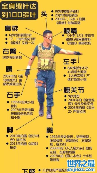 撕掉“搞笑人”这层标签,工作中的吴京更多的是敬业,此前网上曾流出一张吴京全身伤痛图总结,图中罗列了吴京身上大大小小高达一百多处的伤口,这些伤口都是吴京在拍摄作品时留下的,这些伤口印证了吴京的敬业,也正是这些伤痛才塑造出如今的荧幕硬汉。