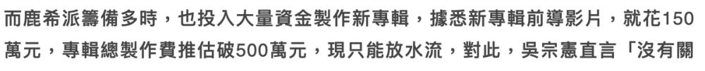 对于这次记者会,最开始鹿希派是准备推出新专辑影片的,并且为此准备了很长一段时间,投入了大量的资金,专辑的总制作费用约500万台币以上(约115万人民币)。