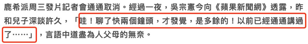 据台媒联系吴宗宪谈及有关其儿子鹿希派方面,吴宗宪表示“聊了快两个钟头,才发觉是多余的!以前已经统统讲过了…”看起来吴宗宪对儿子这次犯的错误感到深深的无奈和失望。