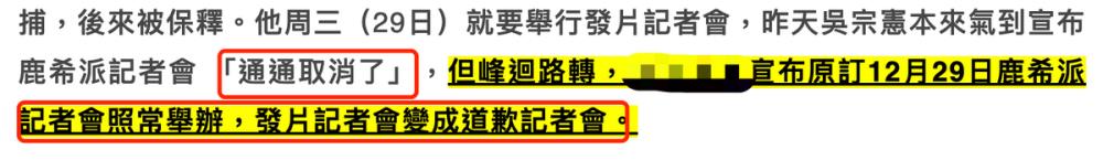 据悉,在鹿希派犯事后的几天,原本将会举行他的记者会来宣传专辑和音乐事业,但是鹿希派这一事情出来后吴宗宪气到宣布记者会“统统取消了”,但是后来又宣布记者会照常举办,只是变成道歉记者会。