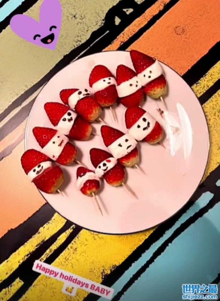 从草莓甜点的照片来看,估计是圣诞节章泽天和老公一起给女儿做的美食。