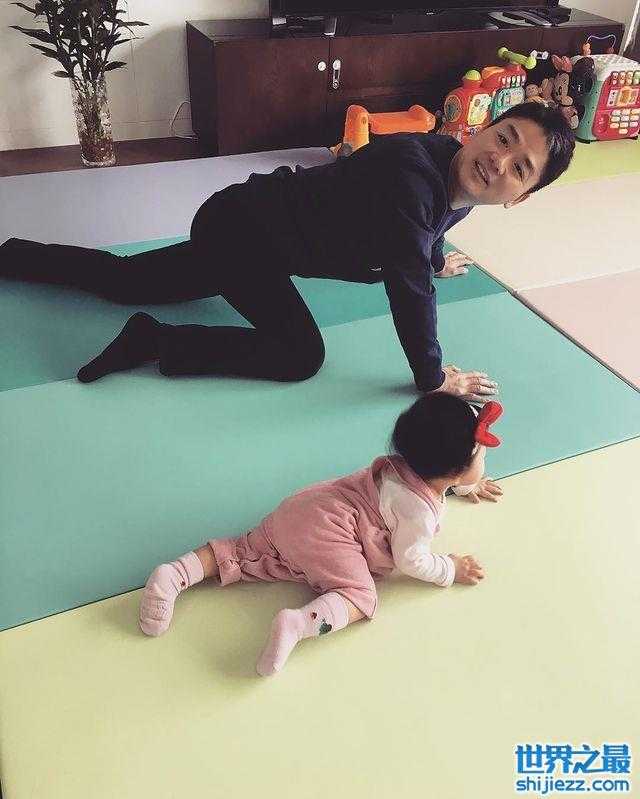 东哥在家中与女儿一起互动,爸爸带着女儿在家中练习爬行的运动,拍摄视角是出自章泽天之手。