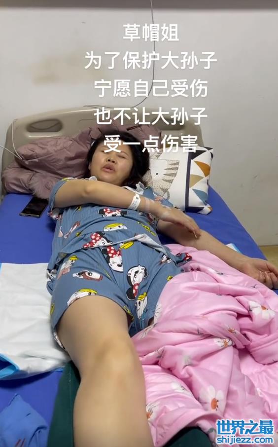 据悉,草帽姐之所以会造成骨折,是因为大孙子老是爬到桌子上玩,草帽姐为了保护孙子这才受的伤。视频中的草帽姐脸上泛着油光,整个人看上去憔悴不少。只见她一只手按住针口,表情略显痛苦。