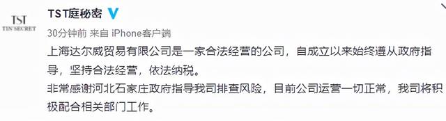 随后张庭林瑞阳夫妇公司发文称该公司自成立以来坚持合法经营、依法纳税,目前公司运营一切正常,会积极配合相关部门的工作。