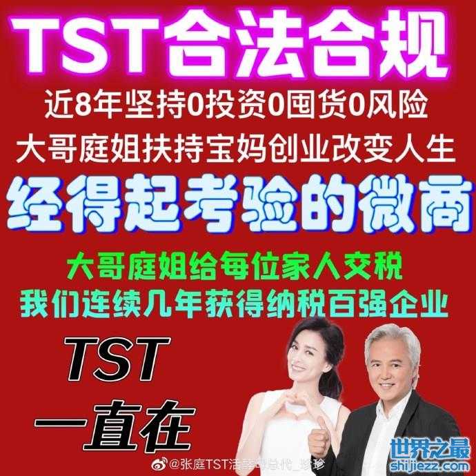 巧的是,张庭公司另一位员工,在今天早上9点多,还晒出一条博文:“TST经得起考验,我们一直在,诋毁TST,是因为我们强大,产品好,模式好,平台好”,还晒出一张图,说:“8年坚持0投资,0囤货,0风险,经得起考验”。