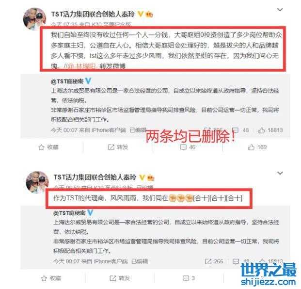 更可笑的是,有一位TST的员工,一直执迷不悟,力挺张庭林瑞阳夫妇,盛赞他们两口子帮助很多人,还称会和张庭林瑞阳风雨同舟。不过,这两条博文目前已被删除。