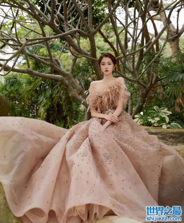 “国民闺女”关晓彤身着一袭粉金色羽毛长裙,宽大繁复的裙摆上渐变式的点缀了亮晶晶的小碎钻,抹胸式的裙子显出窄窄的肩和修长的脖子,配饰简单却又不失庄重,配上精致大气的妆容,整个人宛如从森林里走出的精灵。