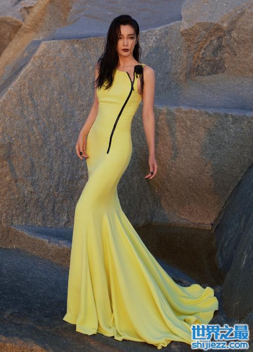 此次担任主持人的李冰冰身着亮黄色复古紧身鱼尾裙,勾勒出曼妙的身材曲线,凌乱随性地湿发加上暗黑色的口红,散发着一种冷冽美,尽显“大花”气质。