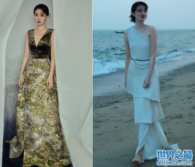 张小斐身着一袭墨绿色V领云锦刺绣礼服裙,大秀肩颈线,墨绿色丝绒质感高级,精致复杂的刺绣大裙摆,十分的华丽大气。另一套造型是白色斜领真丝绉绸连衣裙,腰间的珍珠细腰链显得腰肢盈盈一握,简单又不失优雅知性。