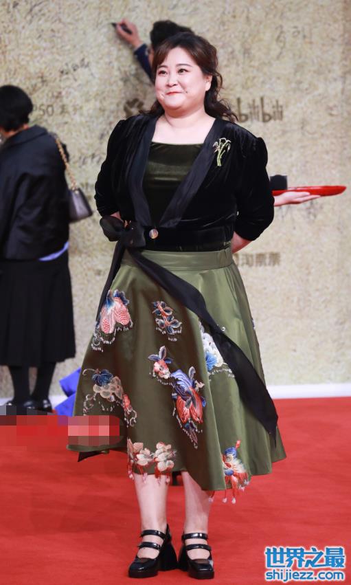 贾玲这一次打扮隆重,不再是以前的卫衣球鞋。墨绿色丝绒方领上衣配上黑色蝴蝶结绑带,下身同样的墨绿色刺绣长裙,脚上穿着黑色玛丽珍鞋,造型既复古又有韵味,给人一种小公主的既视感。