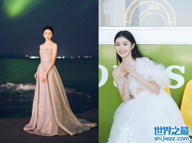 张子枫这一套香槟色水晶点缀方领长裙,露出精致的锁骨线条,腰带上的装饰复古精致,显出窄细的腰,扎着低马尾,脸上妆容清淡,凸显出张子枫优雅的气质。
