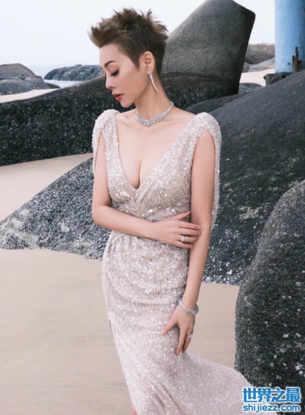 宁静一袭杏色闪钻鱼尾紧身裙,大开的领口露出傲人的事业线,紧身的长裙显出凹凸有致的身材,侧着脸对着镜头露出完美的脸部线条。宁静的这一头利落不羁的短发,又酷又飒,大女人的气质尽显无疑。