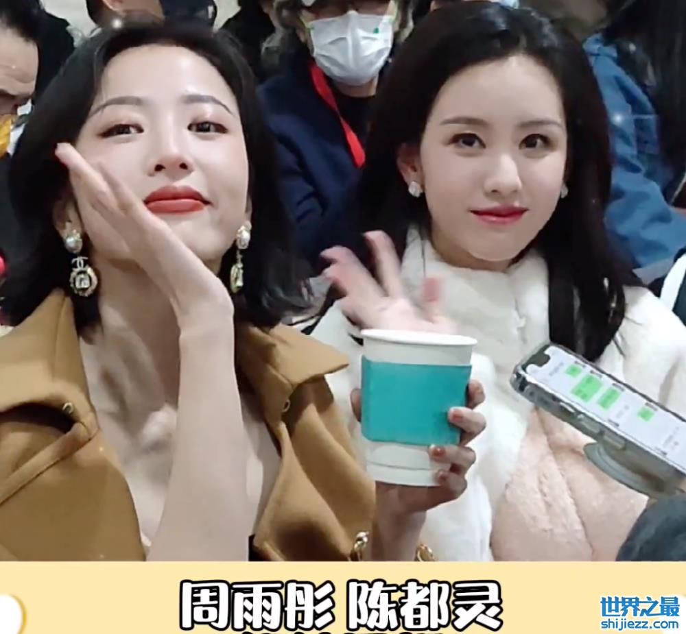 陈都灵和周雨彤似乎是很要好的朋友,两人候场时坐在一起谈笑风生,还非常开心地搞怪合照。看到镜头也很大方地打招呼,果然美女就是要和美女一起玩!