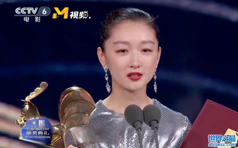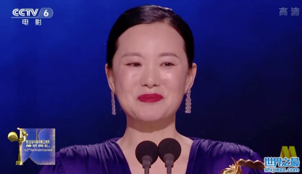 和导演拥抱完之后上场,期间她并没有丰富的表情。但是她在发表获奖感言时,整个声音都在抖,情绪哽咽,说的话也很有意思:只知道丑小鸭可以变成白天鹅,没想到自己这只鸭子还能变成金鸡。
