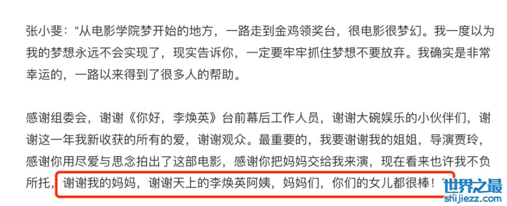在张小斐说获奖感言的时候,她一开始感谢了很多人,最后特别感谢了自己的好姐姐贾玲,感谢贾玲让她来演妈妈。