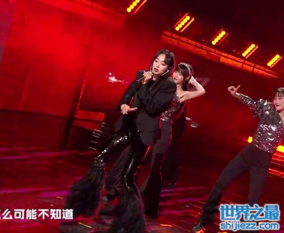 宋茜这次表演没穿仙女裙,走的是酷飒风,一身黑西装搭配同色亮片喇叭裤,这身很复古也很有个性。