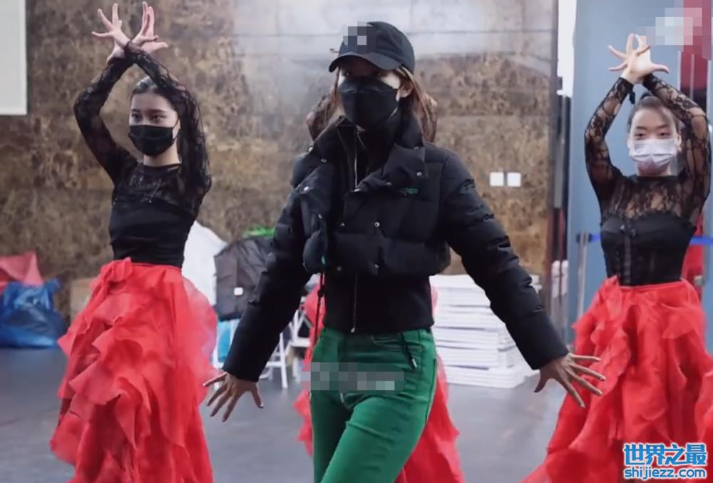 李菲儿上台前还在不断练习,只见她身穿短款背心和低腰裤,露出一截小蛮腰,眼神坚定地看着前方,和伴舞一遍又一遍地熟悉着动作,不难看出她对此次舞台认真的态度。