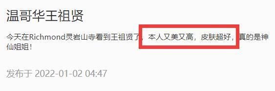 1月2日凌晨,有网友在社交平台晒出偶遇王祖贤的一段视频,并配文说:“温哥华王祖贤,今天在Richmond灵岩山寺看到王祖贤了,本人又美又高,皮肤超好,真的是神仙姐姐!”