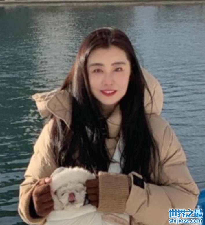 来看看王祖贤没戴口罩的近照,披散着长发,穿着浅咖色羽绒服配粉色百褶裙,怀里抱着自己最爱的狗狗,踩在雪地上,状态真的好极了!