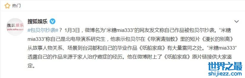 米糖网友:他表示包贝尔在《导演请指教》里的短片《漫长的别离》从故事人物关系、场景到台词都和自己的毕业作品《纸船家庭》有大量雷同之处。“米糖mia333”透露自己的作品来源于家人治疗癌症的经历。他在微博附上了《纸船家庭》原片链接供大家鉴定。