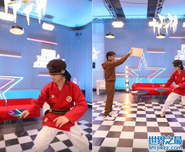 视频中,谢霆锋穿着一身褐色运动装,休闲范十足,只见他单手拿一块木板举在半空中,一脸严肃地看着龙拳小子。龙拳小子其中的一名成员将自己的眼睛蒙上,摆着很专业姿势准备着。