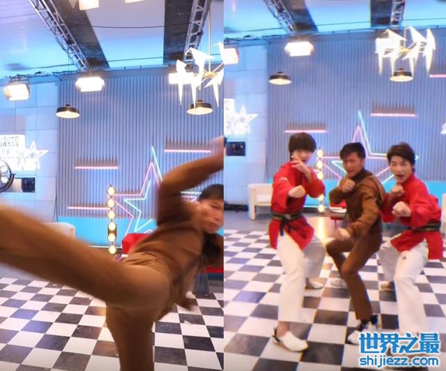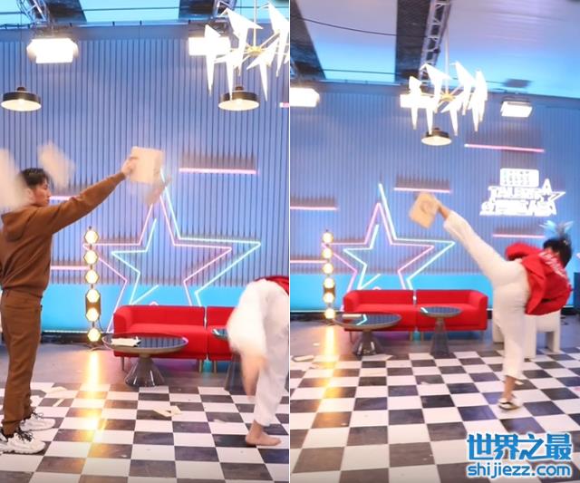 龙拳小子非常厉害,他二话不说一个后踢腿,将谢霆锋手上的木板直接踢成两块,很是轻松。谢霆锋还被他这一股力量给冲击到,脸上的肉还抖动了一下。谢霆锋又扔一块木板在空中,龙拳小子还是轻轻松松地将其踢成两半。