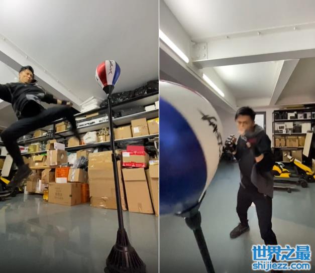 谢霆锋在力量训练从不含糊,他在一个小仓库里装一个类似沙包的健身器材,只见谢霆锋双手穿好手套,一脸严肃的盯着健身器材,他跃起后直接将健身器材踢歪,双手像雨点一样砸向健身器材,力量感很强。