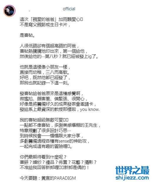 Sandy也同一时间发文:人很低调却又超高调的爸爸,喜帖热腾腾的印出来之后,第一个送给了他,然后给他的第8秒,他就公布了这一个好消息。