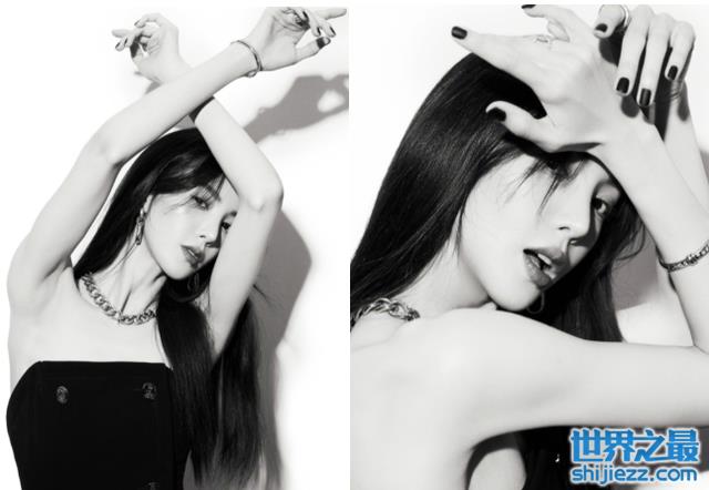 照片中,金晨披着长发,表情严肃眼神霸气的看向旁边。她跪着的姿势,双手交叉的支撑在地上,显出她很细的腰线。金晨斜侧着站着,双手弯曲举过头顶,她的模样妩媚又艳丽。