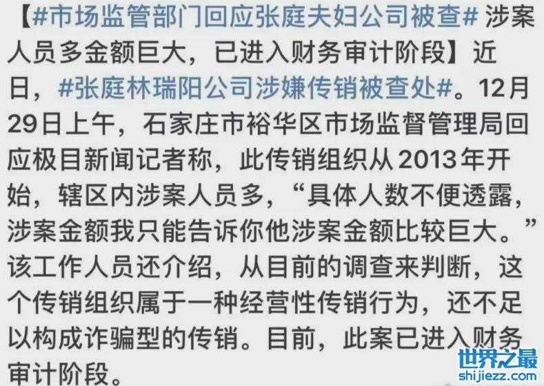 近日,张庭与林瑞阳事业翻车的消息成为备受热议的年末大瓜,众所周知,张庭夫妇近年来手下经营的事业可谓是风生水起,两人借此也是吸金无数,不过,日前两人手下实控的公司遭到官方部门的查处,原因是其业务涉嫌传销,市场监管部门更是将两人的公司初步定性为“传销组织”。