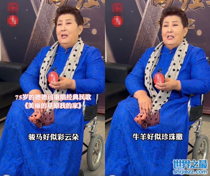 只见德德玛坐在轮椅上,唱起了自己的代表作《美丽的草原我的家》,虽然已经有75岁高龄,但德德玛的嗓音基本上变化不大,歌声高亢浑厚,嘻嘻品味颇有几分草原上的苍茫之感。