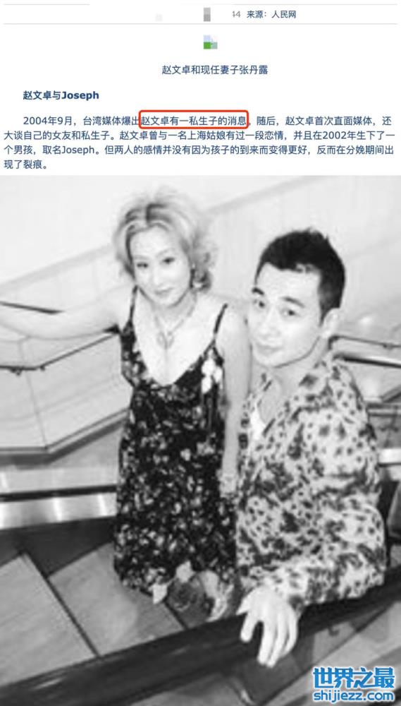 据台媒的报道,知名艺人赵文卓曾被曝出与一位上海姑娘有过一段恋情,两人的恋情是发生在赵文卓与张丹霞之前。并且该上海女子2002年的时候在国外生下了赵文卓的孩子。