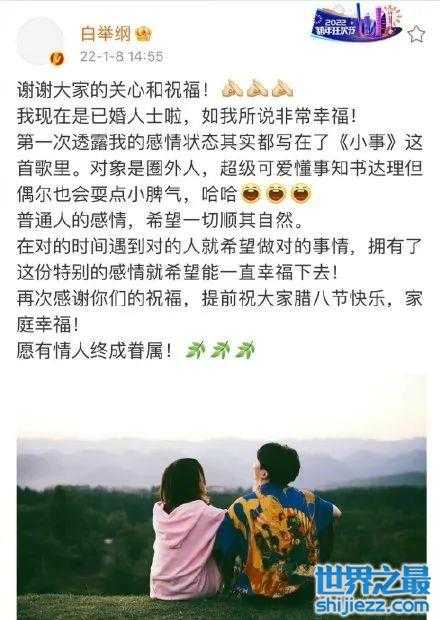1月8日,白举纲在社交平台发文,宣布了一件关于自己的人生大事,那就是他现在已经是已婚状态,另一半是圈外人,所以一直保持低调,如今两个人感情非常稳定且幸福。