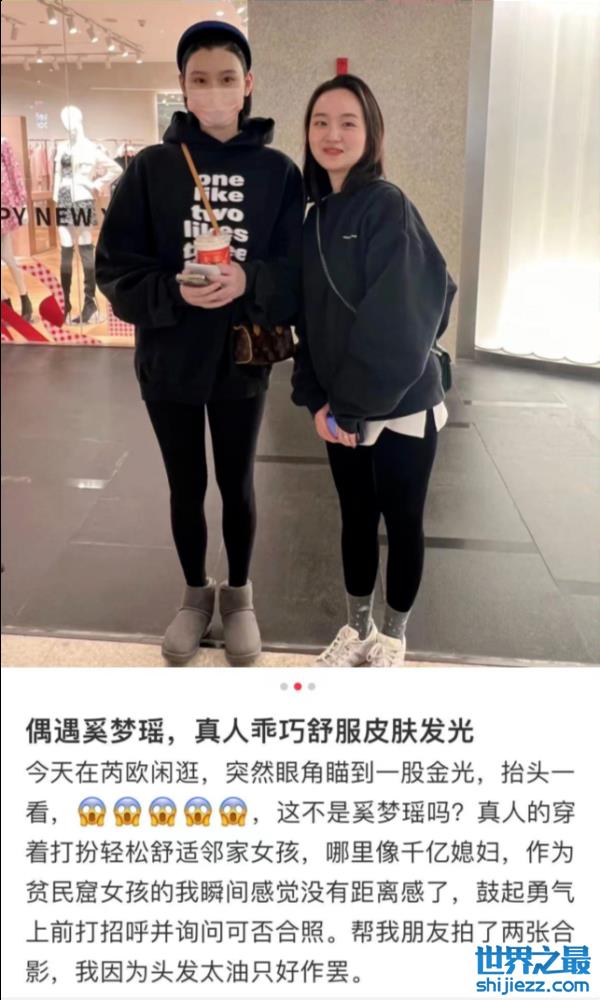 1月8日晚,有网友在逛商场时偶遇到奚梦瑶,直言真人乖巧舒服皮肤发光,偶遇的网友还赞奚梦瑶看上去一点都不像千亿媳妇,因为她穿着非常轻松舒适,更像邻家女孩,给人没有距离感,最后她还鼓起勇气上前与奚梦瑶打招呼并给朋友拍了合影,这次偶遇让这位网友对奚梦瑶的印象很不错,也是毫无豪门媳妇的架子。