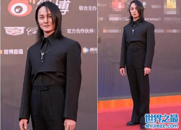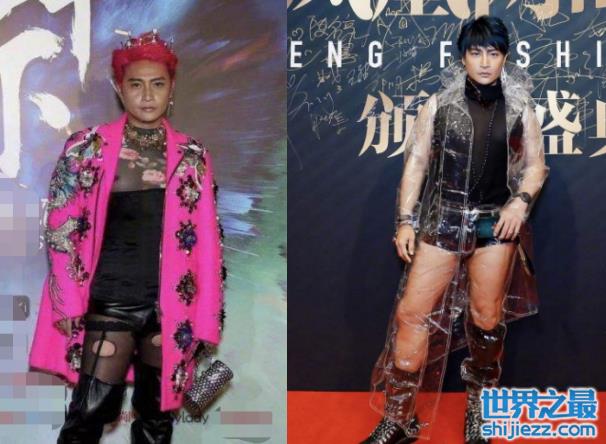 要说红毯上的奇葩造型那就不得不提陈志朋了,这些年他的造型一直给人非常迷惑的感觉。玫红色刺绣花外套,内搭黑色花纹薄纱,腿上还穿着破洞丝袜,一头红发上还戴着皇冠,这一身打扮真的太花哨了。还有陈志朋的这一身透明雨衣加长筒靴,露出健壮的大腿,我觉得他可能还缺一把雨伞。