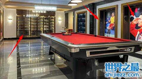 走进豪宅可以看到,林丹特意将一间房间做成了台球室,面积宽敞。在一边的墙上,则是做了整面墙的酒柜,摆满了无数名酒,琳琅满目。另一面墙,则是挂着林丹荣耀时刻的巨幅画像,作为自己传奇运动生涯的见证,尤其醒目。