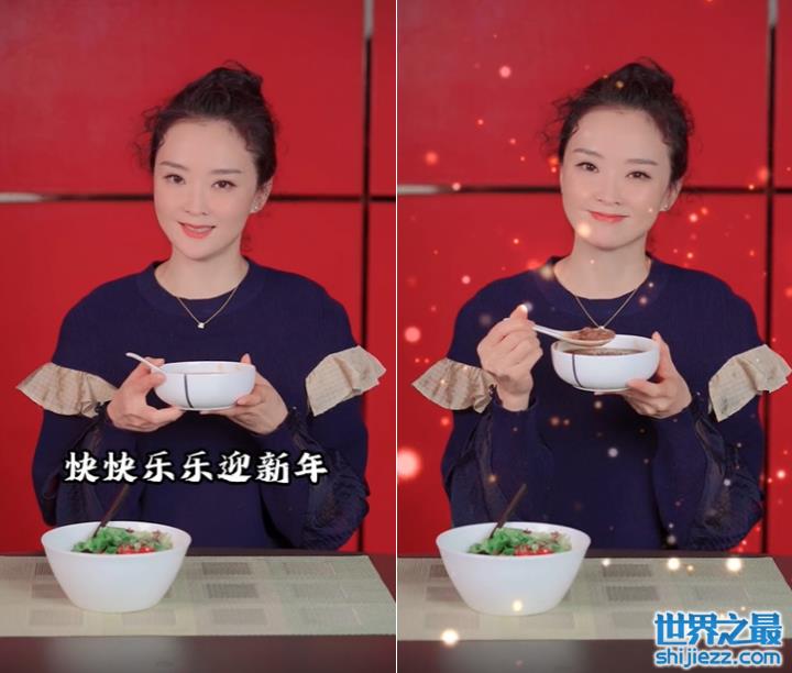 视频末尾,王艳用勺子舀起腊八粥,一脸甜美笑着道:“快快乐乐迎新年”。