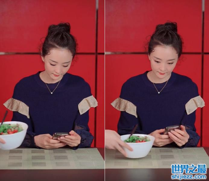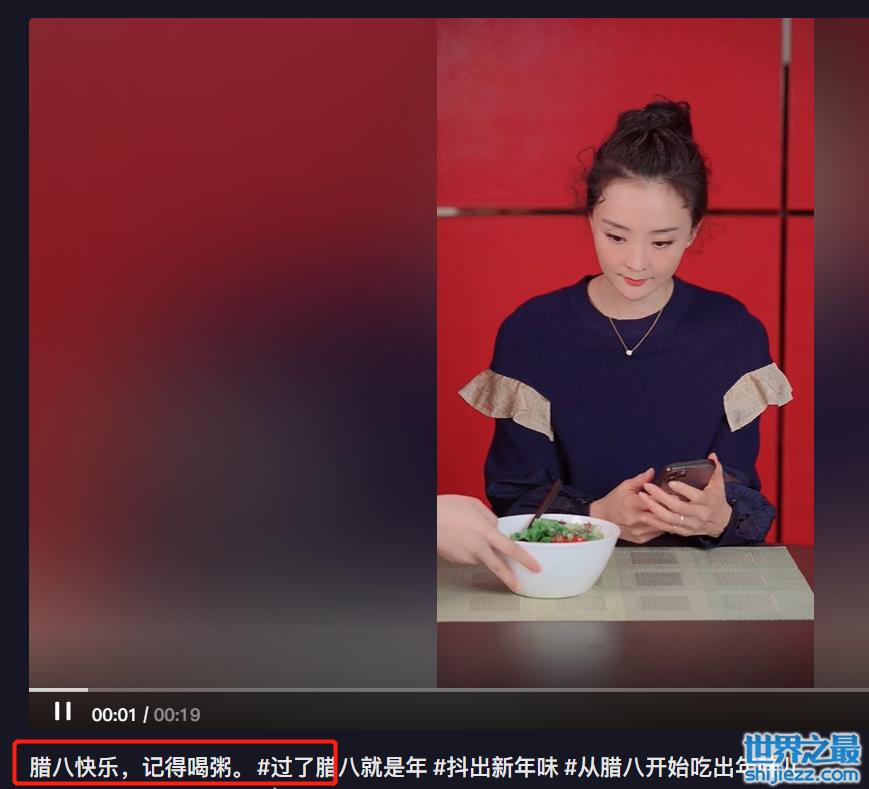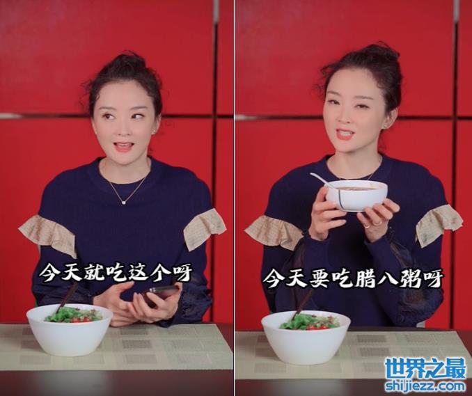 王艳的工作人员在旁边端上一碗沙拉给她,王艳本来在玩着手机,看到沙拉后,用着十分调皮的口吻说道:“今天就吃这个啊”,小眼神也是很可爱。王艳放下手中的手机,从身侧端出一碗腊八粥,双手面对着镜头开心地捧着。