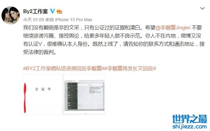 by2工作室:我们没有颠倒是非的文采,只有公证过的证据和清白。希望李靓蕾不要继续诽谤污蔑、操控舆论,给更多年轻人做不良示范。你人不在内地,微博又没有认证V,很难确认本人身份。既然上线了,请告知你的联系方式和通讯地址,接受法律的裁判。