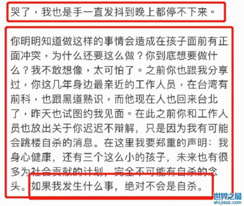 李靓蕾提到了自杀的原因也很简单,那就是看到王力宏带着三个壮汉在门外撞门,准备闯入家中。