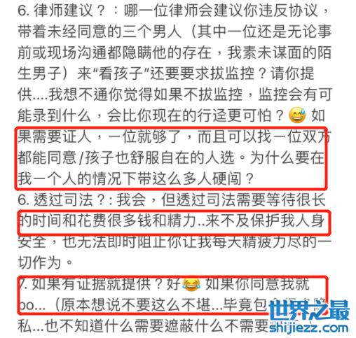 随后李靓蕾如果需要证人,一位便够了,而且可以找一位双方都能同意且孩子也舒服自在的人选,为什么要在李靓蕾一个人的情况下带这么多人硬闯。关于如果有证据就提供一事,李靓蕾称好,如果王力宏方同意的话自己就放出,并补充道原本想说不要这么不堪,毕竟其中包含很多隐私,也不知道什么需要遮掩什么不需要遮掩。文中李靓蕾还称自己会报警,但是流程会等待很久,来不及保护自己人身安全。