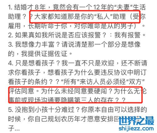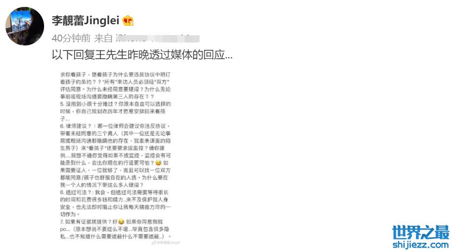 图片中李靓蕾共罗列出八点,一一做出回应。图片中李靓蕾先是表示“夫妻”生活助理其实是王力宏的“私人”助理,受雇用于他且长期听命于他。随后李靓蕾还称自己有报警,对于男方所说的只想看孩子,李靓蕾更称自己不仅从未不欢迎王力宏看小孩,甚至还不断请求男方看孩子,自己只是控诉王力宏来探视孩子为什么未经同意来硬闯,隐瞒第三人的存在。