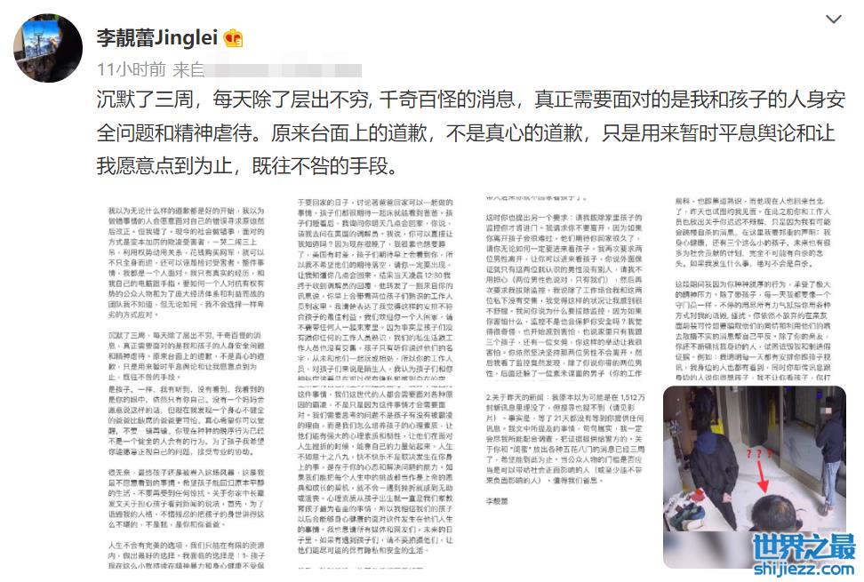 昨晚李靓蕾深夜发文控诉王力宏“原来台面上的道歉,不是真心的道歉”,并晒出王力宏携带三名工作人员在家门口骚扰自己与孩子的照片。在文中,她还表示“我每天都活在炼狱里,身心疲累”,孩子更是被陌生人强闯上门给吓哭。